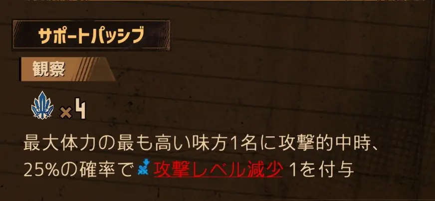 效果:最大體力最高的一名我方攻擊命中時25%賦予物件1攻擊傷害量減少