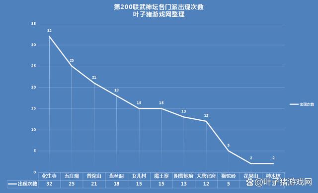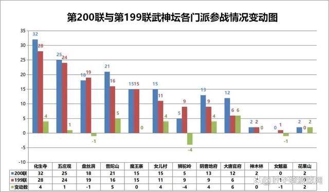 由於這屆服戰總場次比上屆多兩場,兩屆比賽的總門派次數不相等,這回就著重分析哪些門派有參戰,哪些門派沒得參戰了。上屆坐穿冷板凳的花果山,在本屆賽事中把板凳交給了女魃墓後又重返賽場,使用者分別是西柵老街和夫子廟。