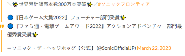 在《索尼克:未知邊境》首次免費更新之前,世嘉宣佈該作自發布以來,銷量已售出300萬套,距離2月10日公佈290萬套有一個多月的時間。迄今為止,這款遊戲銷售量已超過世嘉預期。