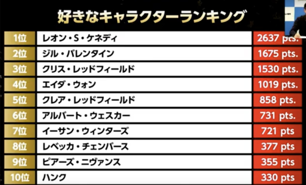其他方面,艾達王的高人氣不用多說,威斯克是入圍的唯一真反派,6代的皮爾斯是比較沒有存在感的主角(獲355票),麗貝卡如果不是近代的模型變化,個人感覺可以更高一些。統計僅限日本地區,其他地區可能有所不同,不過里昂拿第一應該爭議不大。