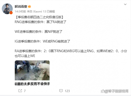 可以說,現在的情況對IG的選手而言非常不利,但想要進入季後賽也不是全無機會。在多支隊伍已經確定季後賽席位的情況下,RNG(7-8)、WE(7-8)、IG(7-9)只有兩支隊伍能夠晉級。LPL解說中的“算分達人”雨童,對現在的形勢做出了分析,為IG給出的晉級條件為: