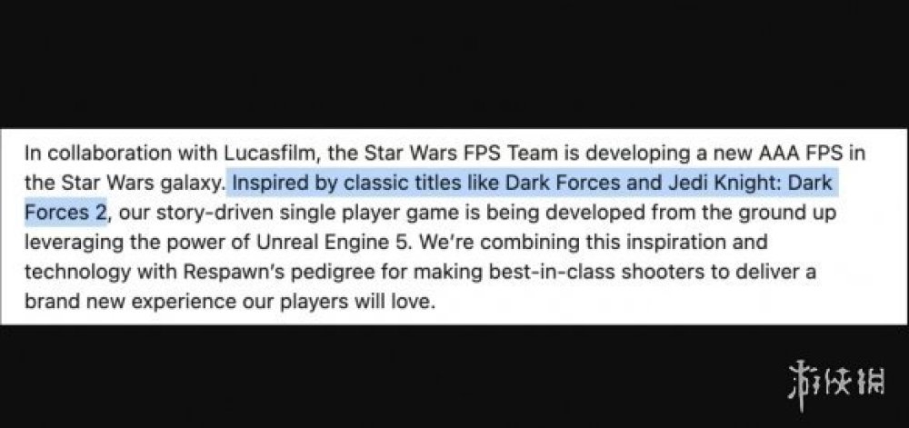 早在2022年1月份,EA重生工作室(Respawn)就透露他們正在開發3款以《星球大戰》IP為背景的新遊戲,其中一款是單人FPS遊戲,其他兩款是《星球大戰:絕地 倖存者》和與 Bit Reactor 一起開發的回合制戰略遊戲。而最近重生髮布的招牌資訊中透露,這款單人FPS遊戲靈感來自經典遊戲《絕地武士:黑暗力量》系列,並採用虛幻5開發。