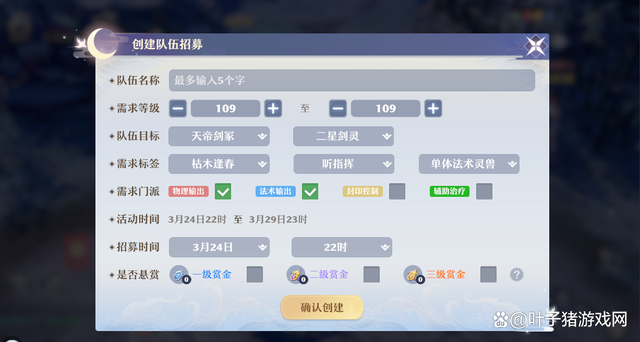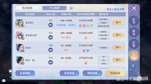 招募頁面做得非常詳盡,包括需求標籤可以選擇特技、指揮語音、靈獸寶寶、職業門派等,為了吸引更多大神、大佬玩家前來相助,你還可以使用金錠購買懸賞令,一級、二級、三級賞金獲得對應價值的元寶,180元寶/540元寶/1080元寶,將平均分配給隊員。