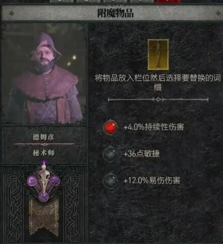 暗黑4的附魔是指將裝備的上的1條隨機詞綴進行替換改變,如下圖