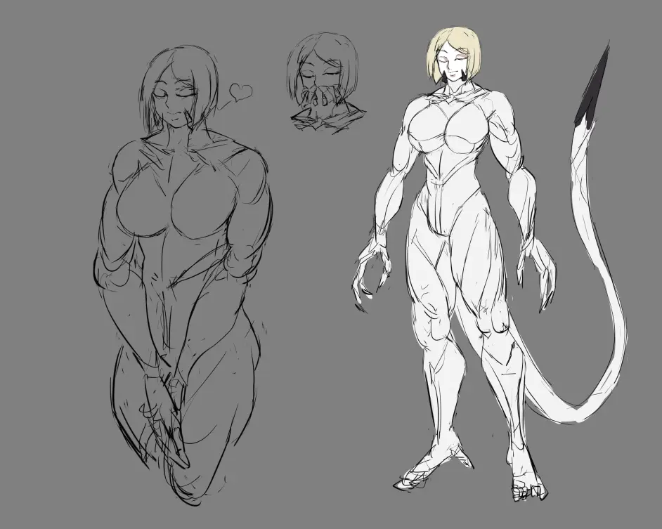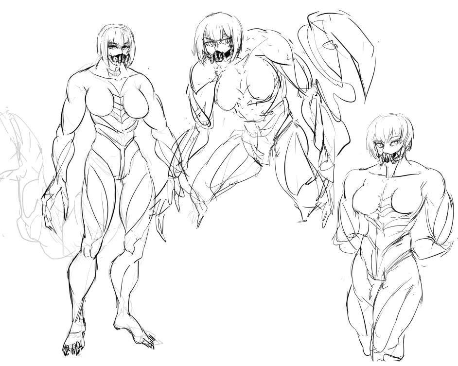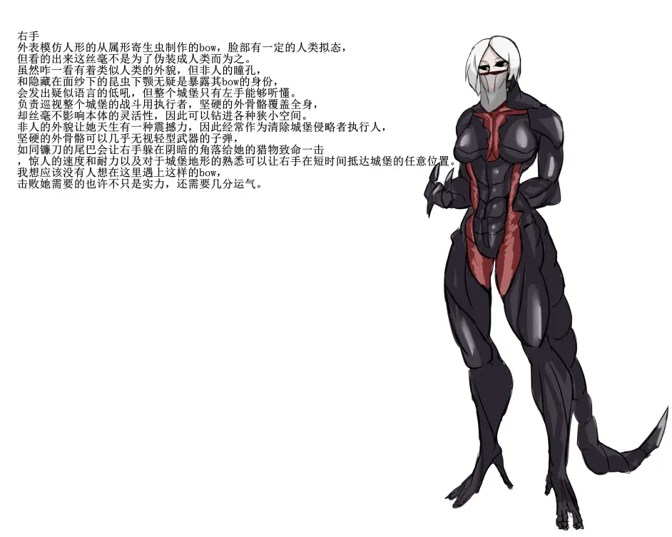 右手有三次大改,最開始想著右手和左手兼用一張臉,只改配色,後來想了想不夠有趣,就改成現在這樣,比較喜歡這個深V護甲和高跟外骨骼