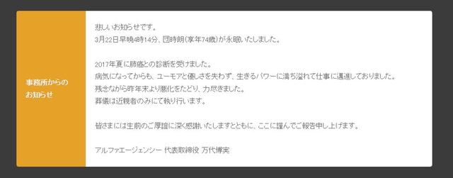 根據事務所Alpha Agency的訊息,特攝劇《歸來的奧特曼/傑克奧特曼》主人公鄉秀樹(傑克奧特曼人間體)飾演者團時朗於3月22日下午4點14分因肺癌去世,享年74歲。據事務所代表董事表示,團時朗在2017年確診肺癌,而情況在去年年底開始惡化,其葬禮將由近親舉行。