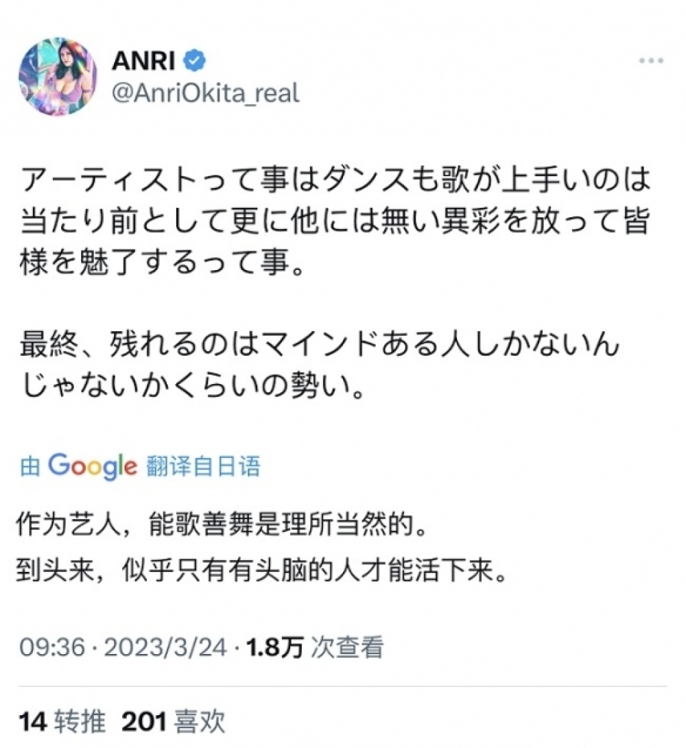沖田杏梨自己也在推特上提了一句:只會唱跳的藝人,似乎有點兒難出頭啊?