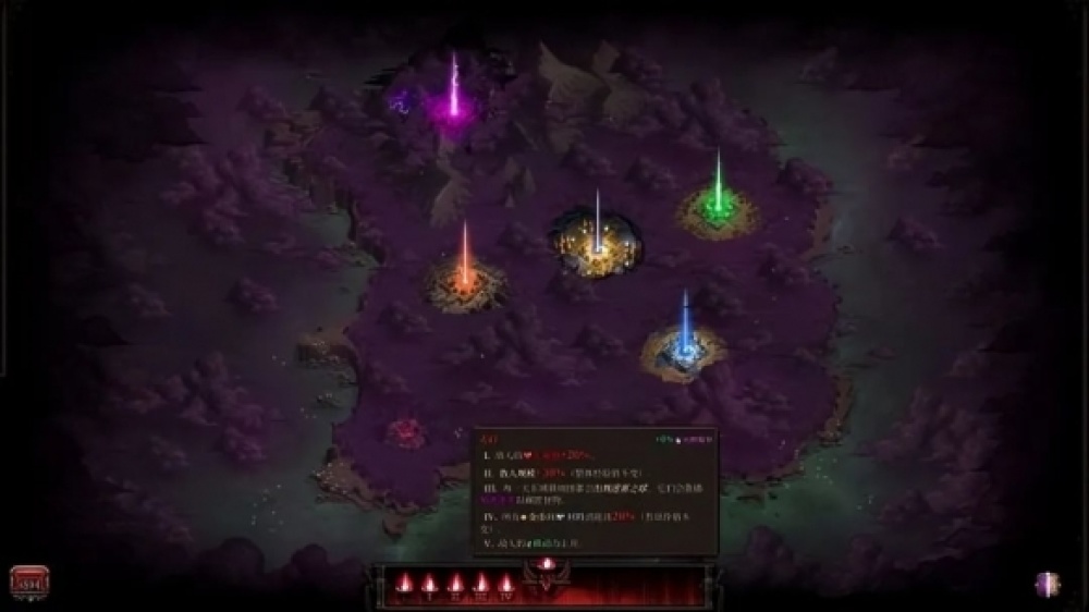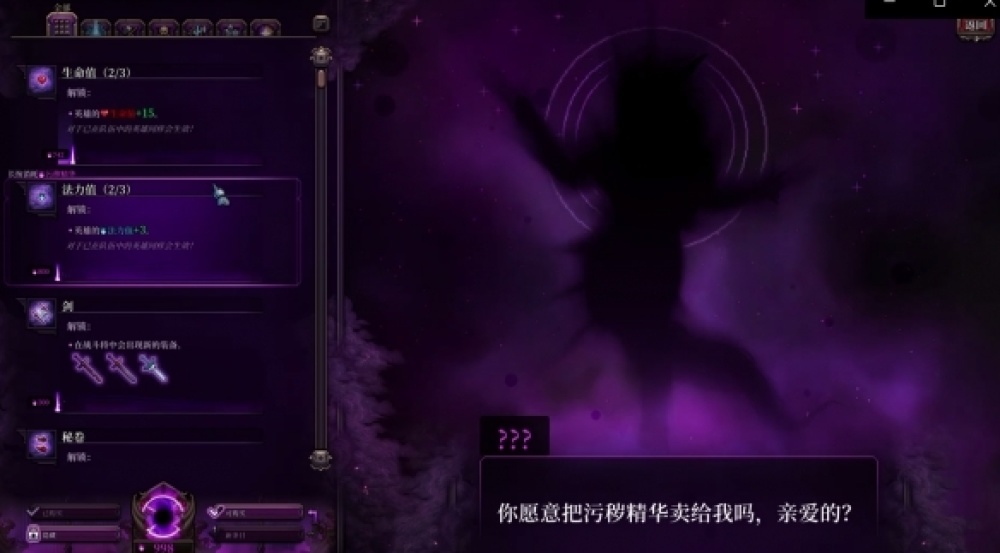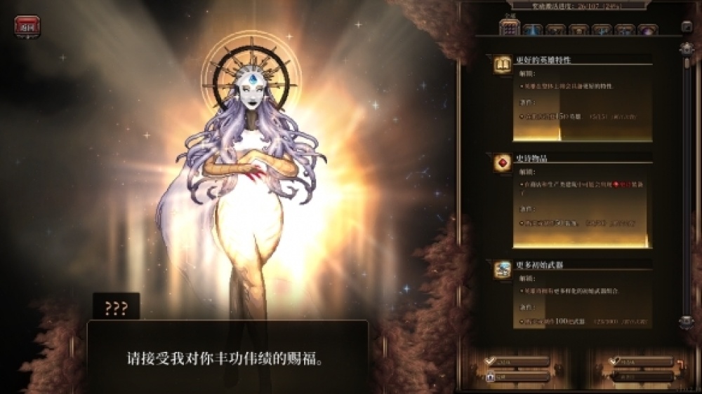 而黑暗的解鎖內容則是根據遊戲中獲得的“汙穢精華”來對解鎖條目進行,充滿一條專案即可解鎖,解鎖的內容包括了新的武器、裝備、建築、更好的初始roll人物等等。
