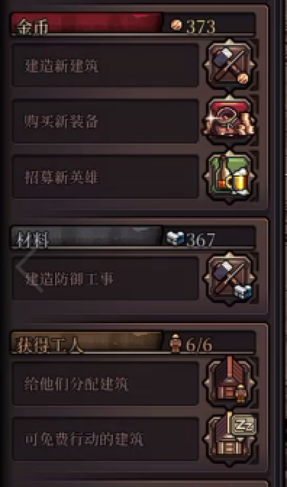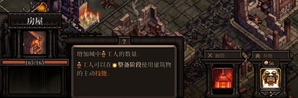 比如拆除廢墟(廢墟越大消耗工人勞力越多)換取空地與資源;搭建鎧甲、弓箭、法術、刀劍、鍊金等各式店鋪(可以按時間生成對應型別的隨機裝備,增派工人可以提升生產速度); 在升級後的商店為英雄購買過更高階的裝備,或者建造生產金幣、防具的工廠;或者是裝載投石車與陷阱,以此強化夜間的防禦。