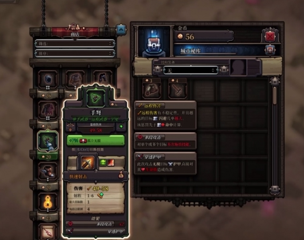 此外就是項鍊和衣服也會附帶技能,比如重甲可以花費一點行動力疊甲、輕甲則是可以疊閃避、有的項鍊可以釋放大型aoe等等,儘管有時候裝備詞綴和它的技能貨不對板,像是疊加遠端傷害的弓手的項鍊卻有魔法傷害的火球術,享受不了半點傷害加成,但相信我,玩多了你會喜歡這額外的傷害來源的;