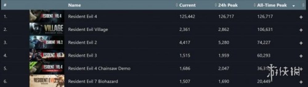根據Steamdb資料記錄,Steam上迄今為止最火爆的幾款《生化危機》遊戲分別如下(以下資料為遊戲的同時線上玩家數):