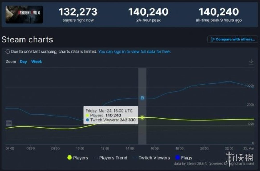 昨天我們報道了Steam《生化4RE》線上人數達到12.6萬人的新聞。而現在,根據SteamDB的最新資料顯示,該遊戲的線上人數峰值已經突破了14萬人(140,240人)!截止到目前為止,仍然有132,273人在遊玩這款遊戲。考慮到雙休日已經到來,預計該遊戲的熱度會在今明兩天繼續攀升。