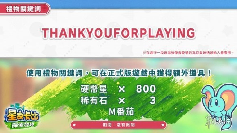 這次的新禮物關鍵詞為“THANKYOUFORPLAYING”,也是“感謝你的遊玩”的意思,玩家只要在遊戲中的郵局處輸入即可獲得額外道具——800個硬幣星和3個稀有石,為無期限領取。