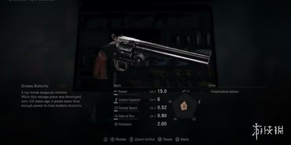 中折式馬格南左輪手槍,雖然射速慢但傷害給力,並且具有非常令人滿意的穿透能力。但馬格南彈藥十分稀有,因此只有在適當時機使用折翼蝴蝶才能使里昂瀟灑的離開村莊。