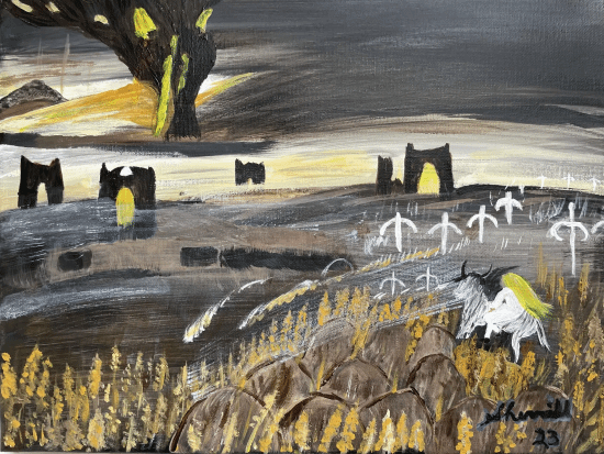 Terra-Ray稱,他的母親在眼部接受手術後開始畫畫,這讓她大腦的創造力重新煥發了活力。熟悉《艾爾登法環》的玩家可能會發現,這張畫的靈感來源於官方釋出的DLC宣傳圖。而根據Terra-Ray的說法,圖中騎馬的人是他的兄弟,他在很小的時候夭折了。