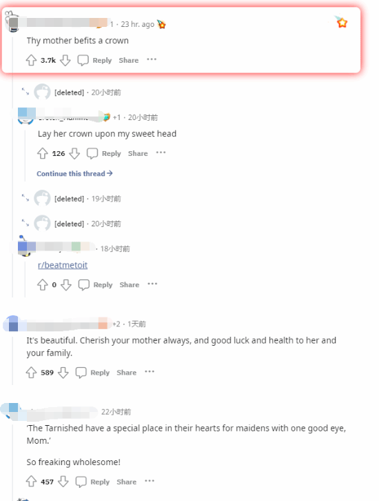 這幅畫作讓評論區的許多玩家備受觸動和鼓舞,他們為Terra-Ray的母親獻上了讚美和祝福。Terra-Ray將他的母親看做“宵色眼眸女王”,其他玩家則表示“她配得上王冠”。