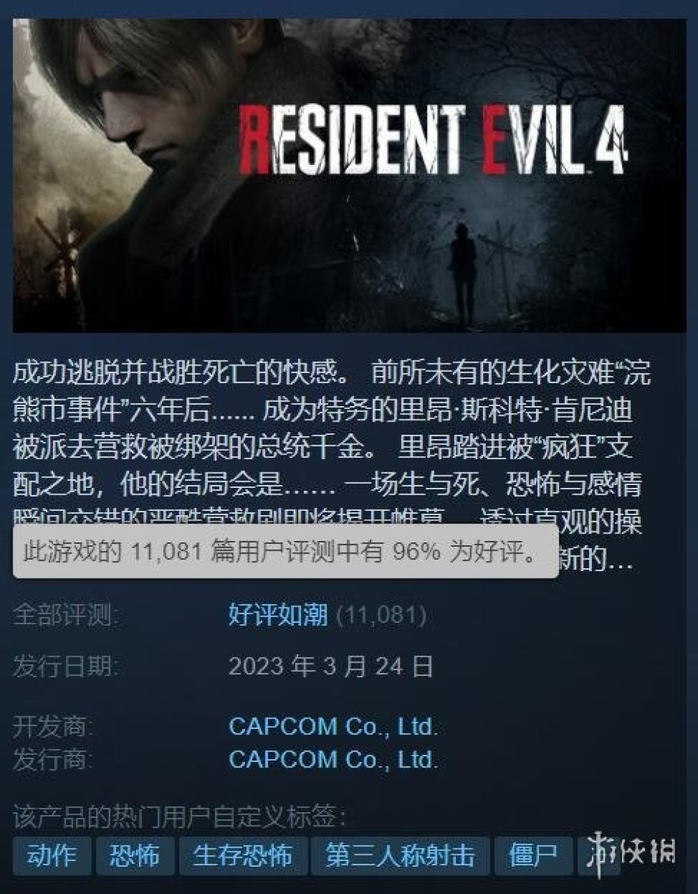 就在今天(3月26日),《生化危機4:重製版》的Steam評論數已經破萬了!截止到發稿時為止,該遊戲在Steam上的評論數為11081條,而好評率也繼續上漲,達到了96%!總評價為「好評如潮」。