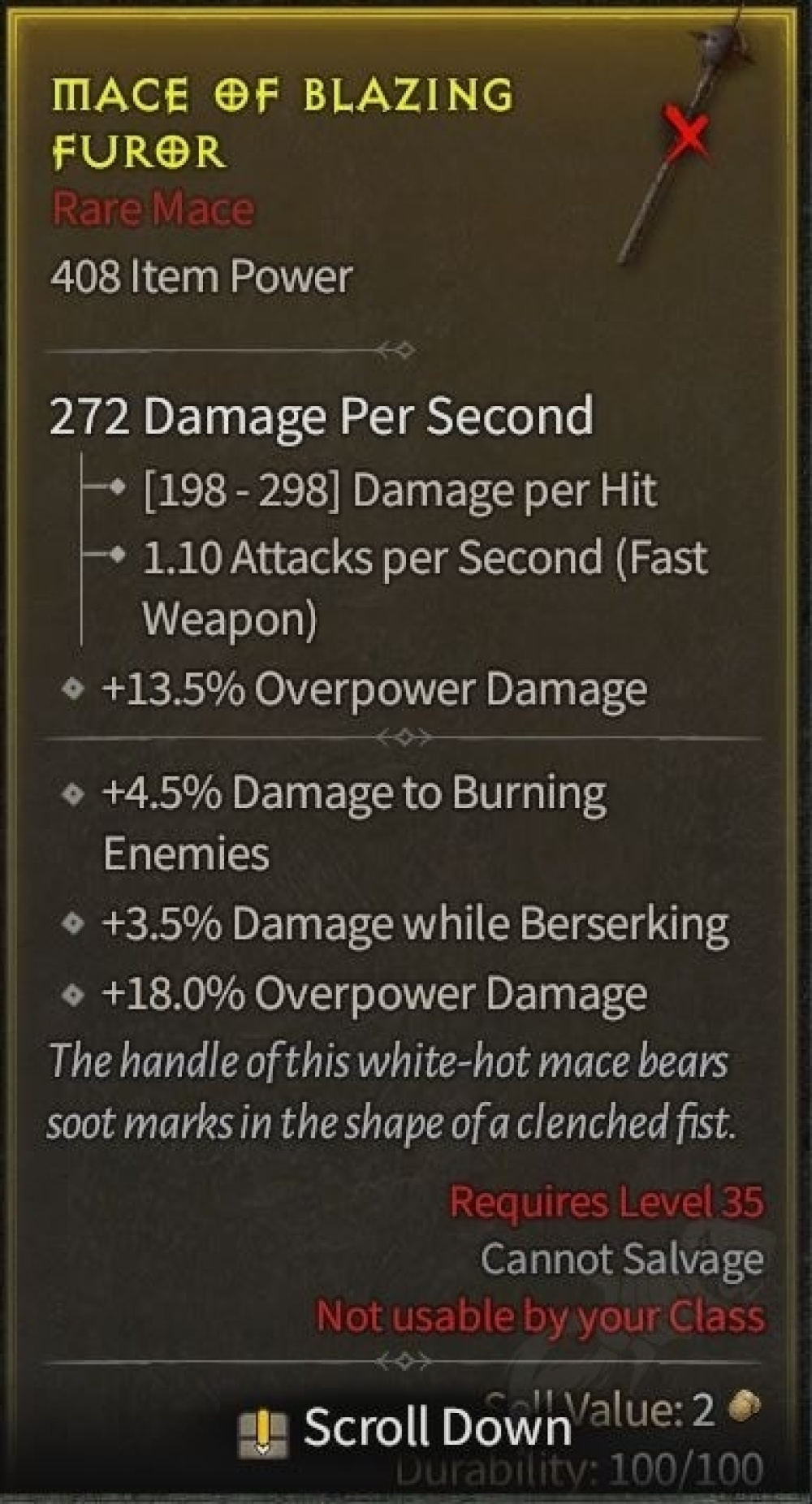 Osgar會掉普通、魔法和稀有物品,其中包括一個35級的專屬武器:Mace of Blazing Furor,這是一把適合野蠻人的金色錘子(可用威能降低需求等級),前期拿到逆天,其他掉落為23-27 級。