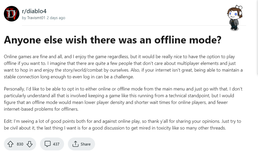 從3代開始,暗黑系列的遊玩需要保持線上,而在暗黑4的公測之後,離線模式的呼籲再次響起。