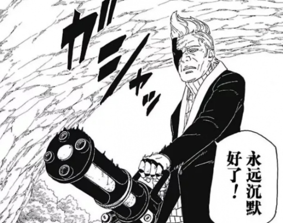 除此之外,博人傳中的火影世界觀也從高魔低科技的世界光速躍遷至高科技世界,如果說只有卷軸u盤、戰鬥機甲還能接受(這個可以用傀儡術解釋),但在戰勝機器傀儡大軍後,端著加特林的忍者“青”登場,我就知道這場戰鬥已經進入了完全不可理喻的火爆場面了。