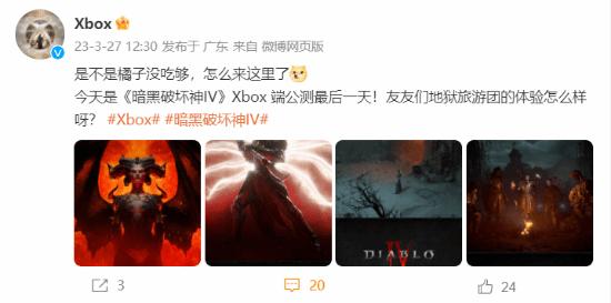 今天是《暗黑破壞神4》公測的最後一天,Xbox官博發文詢問玩家們遊戲體驗如何。