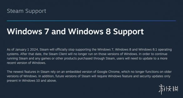 Steam官方表示:從2024年1月1日(時差關係國內可能晚一天)開始,Steam將不再支援Windows 7、Windows 8、Windows 8.1系統。在那之後,Steam客戶端將無法在這些系統上執行。為了繼續使用Steam以及上面的任何產品,使用者必須升級到新版本Windows。