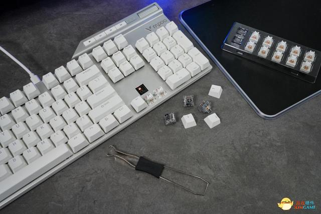 更換軸體時只需要使用附贈的拔鍵拔軸器先將鍵帽取下,在將拔鍵拔軸器插入到軸體下放,將軸體拔出即可。該鍵盤的軸體插拔非常簡單,這讓使用者可以輕鬆更換鍵帽和軸體。