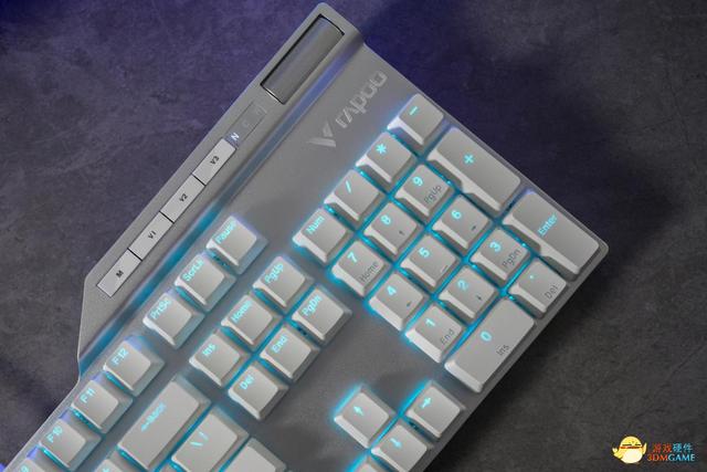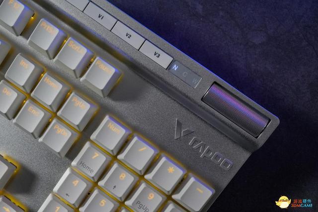 雷柏V700DIY機械鍵盤的上蓋採用了堅固的鋁合金材質,並進行了異形處理,使得整個鍵盤看起來更加硬朗。在鍵盤的右側,還加入了背鰭造型,在背鰭處也增加了5個快捷鍵,使用者可以通過右上角的“M”鍵可一鍵切換遊戲/辦公模式、通過V1鍵可快速切換燈光模式,通過V2鍵可以快速在燈光亮度(預設)與音量控制功能間切換,通過V3鍵可一鍵開啟/關閉靜音,並且通過滾輪進行線性調節,使用起來更加方便,同時增加了鍵盤的科技感和未來感。這種設計非常符合年輕人的審美,讓使用者使用時感到非常的炫酷和舒適。