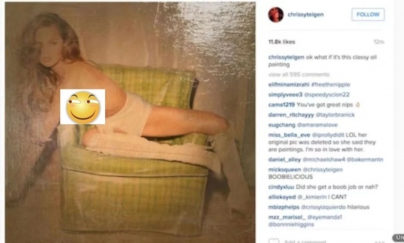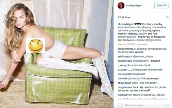 從照片也看得出來,Chrissy只是簡單的用腿擋了下自家老公的私密部位,便直接將照片發了出來。而這張照片順利釋出後,Chrissy Teigen還特意@了ins官方,諷刺平臺的“垃圾稽核”,或者說雙重標準。