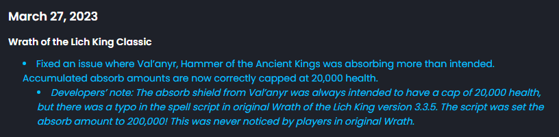 官方解釋說這個特效觸發的護盾最多可吸收2W點傷害,橙武的設計旨在提升目標2W點生命的上限。但在原始3.3.5版本的開發中,程式設計師敲錯了數字,導致指令碼設定吸收上限為20W點傷害。因為無人反饋,這個bug存在了十多年。