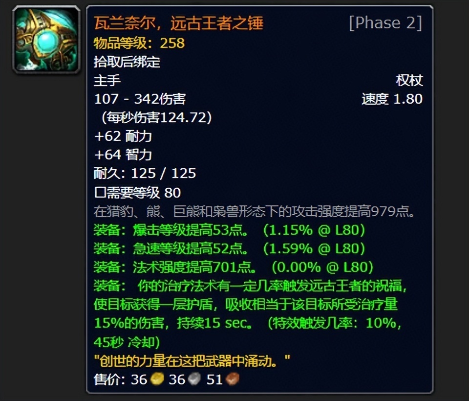 奧杜爾橙錘瓦蘭泰爾是WLK版本首個橙武,沒有提裝等之前是P3治療的BIS,提裝等之後是全版本畢業。橙錘本身的屬性俱佳,配合其特效比25人的巫妖王掉落武器更強。