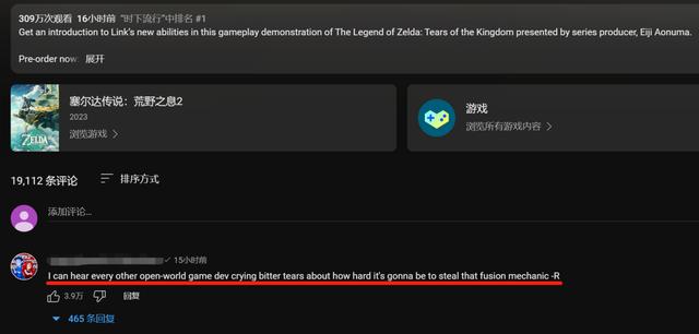 演示視訊的資訊量並不算大,也就區區4項遊戲的基本系統而已。但老話說得好,“塞爾達”的4個玩法,可以震撼整個遊戲業界。這可不是什麼玩笑話,同樣的實機演示,在油管的北美任天堂頻道上一樣達到了300萬播放,甚至連點贊和評論的資料都和B站大差不差。