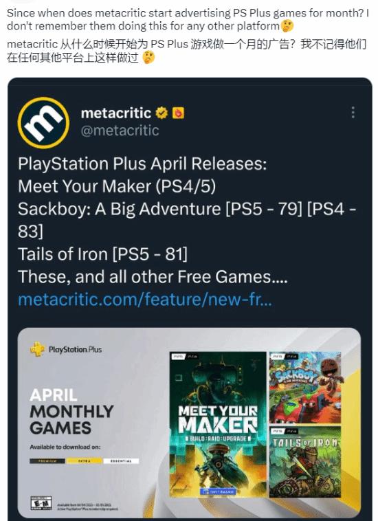 PS Plus 4月會免已正式公佈,有玩家發現,M站竟然開始發文為PS會免宣傳,之前他們沒有給任何平臺打過廣告。