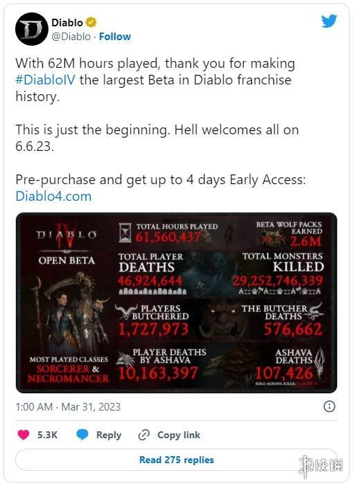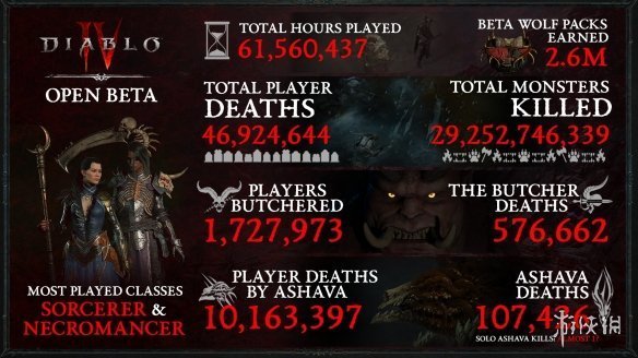 《暗黑破壞神》官方推特今天釋出了一張《暗黑4》測試的資料圖,展示了此次測試所達到一些驚人的資料,一起來看看吧!