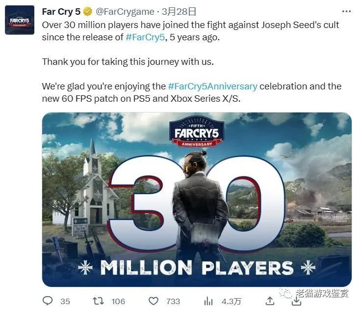 3 月 30 日訊息,育碧官宣,《孤島驚魂 5》玩家人數已突破 3000 萬,該遊戲已發售 5 年。