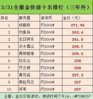 今天給大家帶來3月末全服金價排名,從上述名單中可以看到,成都府的比例是最高的,同時與第二名拉開了巨大差距。如果去對比去年的金價排行,可以明顯的感受到,大部分伺服器的夢幻幣比例有所降低,個別大區甚至跌到了225R左右(3000W)!