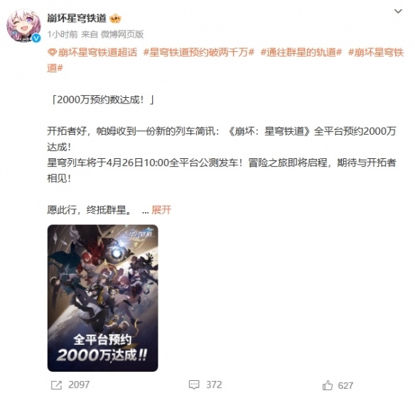 《崩壞:星穹鐵道》官方宣佈,遊戲全平臺預約人數已經達到了2000萬人。目前,距離該作開啟預約剛剛過去一週的時間,這意味著,在短短的七天時間內,就已經有上千萬人預約了遊戲,可見本作的火爆。