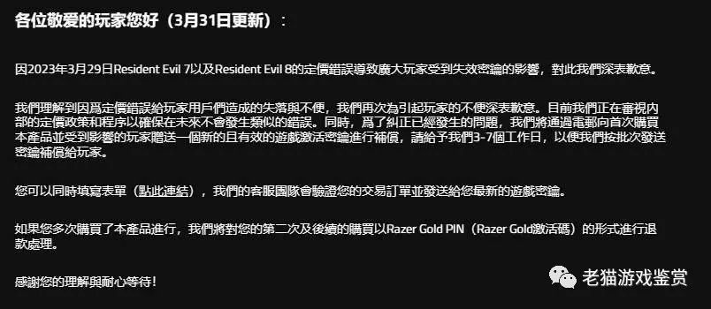 雷蛇商城出現了《生化危機7+8黃金版》捆綁包定價51元的臨時工情況。雷蛇官方對此做出了迴應,將為購買了定價失誤版《生化危機7+8黃金版》的玩家重新發key,而如果玩家多次購買了產品,則第二次及後續購買將會以Razer Gold PIN(Razer Gold啟用碼)的形式進行退款。