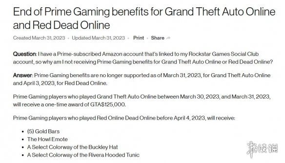 R星官網釋出新的公告,表示Prime Gaming福利即將關閉。2023年3月31日起,《GTA OL》不再支援Prime遊戲福利;2023年4月3日起,《荒野大鏢客OL》不再支援Prime遊戲福利。