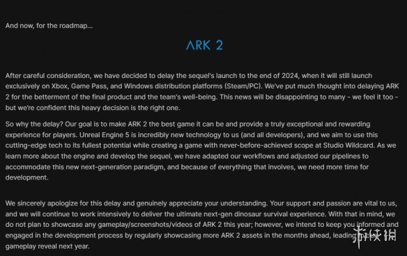 開發商WildCard在官網社群論壇上宣佈《方舟2》將延期至2024年,開發商表示虛幻5引擎對他們來說是全新的技術,他們需要更多的開發時間,他們的目標是使《方舟2》成為最好的遊戲。