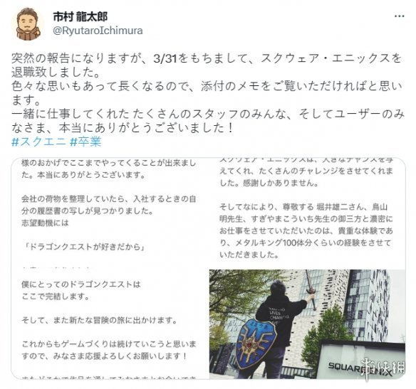 《勇者鬥惡龍》系列製作人 市村龍太郎 在3月31日宣佈從SE離職退休。他此前已在SE工作近20年,開發了《勇者鬥惡龍8》《勇者鬥惡龍9》等作品。