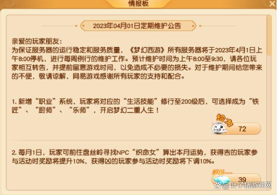 2023年4月1日,夢幻西遊開啟了“新維護”。本次維護後,玩家可以將生活技能提升至200級,並能選擇成為鐵匠、廚師、樂師等。每月1日,玩家還可以前往盤絲嶺尋找NPC“織命女”算出本月運勢,獲得“吉”即可增加10%的活動獎勵,獲得“凶”則下調10%的獎勵。