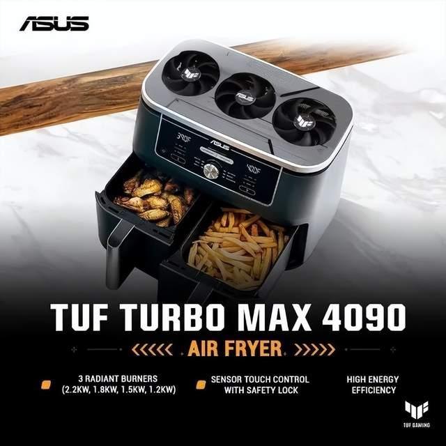 華碩公佈了配備4090顯示卡的空氣炸鍋,官方在介紹中寫道:更健康的食物來了,多虧了全新的TUF Turbo Max 4090!配有最新的三軸技術風扇和8核Al CPU,您最喜歡的飯菜將根據您即將面對的下一場戰鬥完美烹飪。