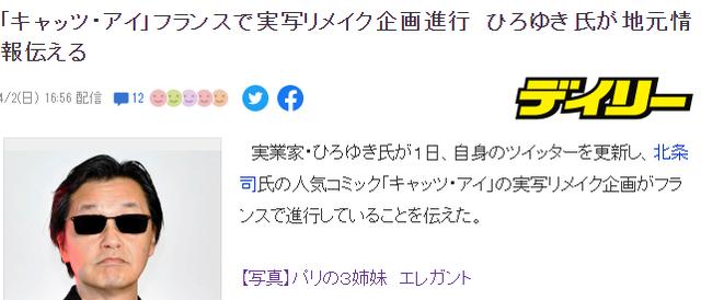 4月1日據日媒報道,北條司通過朋友透露訊息,代表作之一的《貓眼三姐妹》將拍真人劇,預定在法國製作,敬請期待。