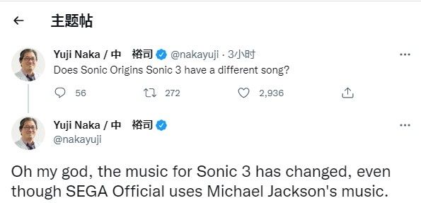 昨日(2022年6月23日)是索尼克系列的31歲生日,《索尼克:起源》也於昨日一同發售。索尼克之父「中裕司」在昨日的發文中提到了《刺蝟索尼克3》,文中中裕司似乎確認了邁克爾·傑克遜曾經參與過本作的配樂工作。