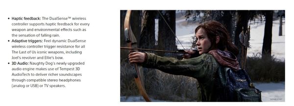 另外頁面還公開了一些關於適配DualSense手柄的新細節,重點提到了觸覺反饋和自適應扳機功能。頁面顯示,游戲支持每種武器和環境效果的觸覺反饋,例如玩家可通過手柄感受到下雨的感覺,另外自適應扳機將支持所有武器,包括喬爾的左輪手槍和艾莉的弓。