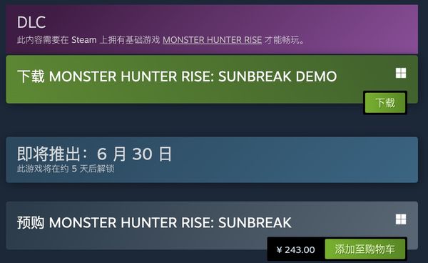 《怪物獵人崛起:曙光》將於6月30日登陸到Steam和Switch平台,遊戲發售之後仍然會保留試玩版。該資料片現已在Steam商城開啟預購,售價243元,支持簡體中文。