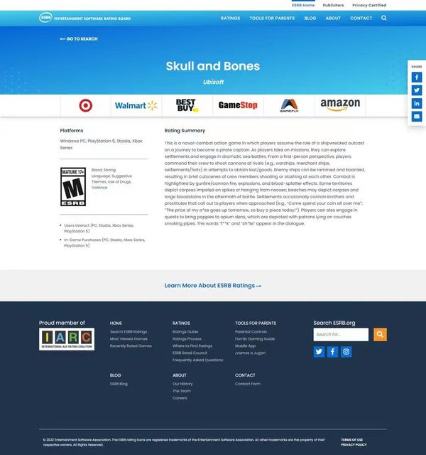 早於2017年曝光的海戰類MMORPG遊戲《Skull&Bones》近期終於通過了ESRB評級機構的審核。該作目前評級為M級,而登陸平台目前則顯示為PC、Stadia、Xbox Series X/S和PS5平台,發售日期待定。