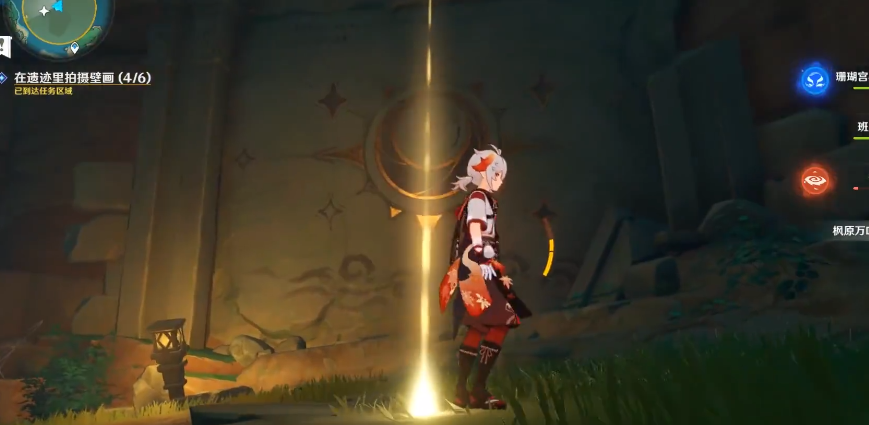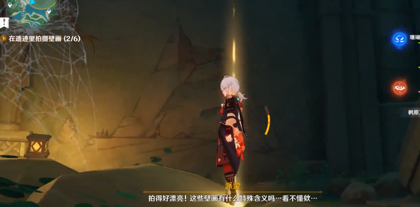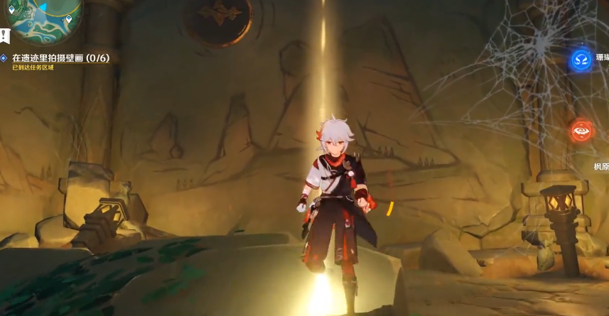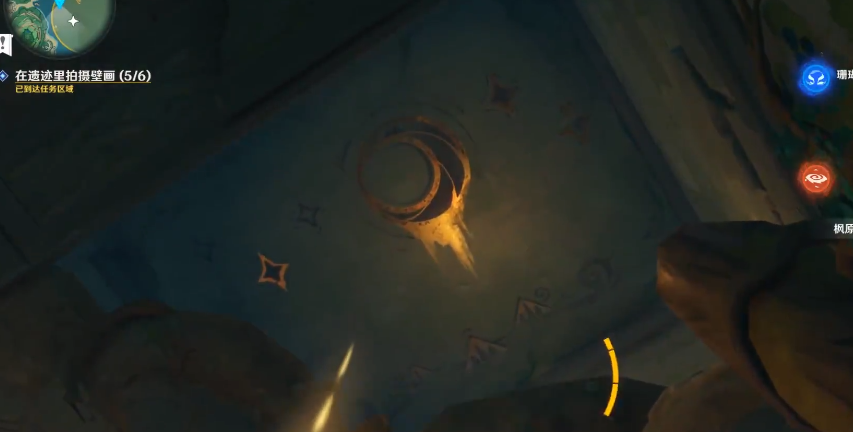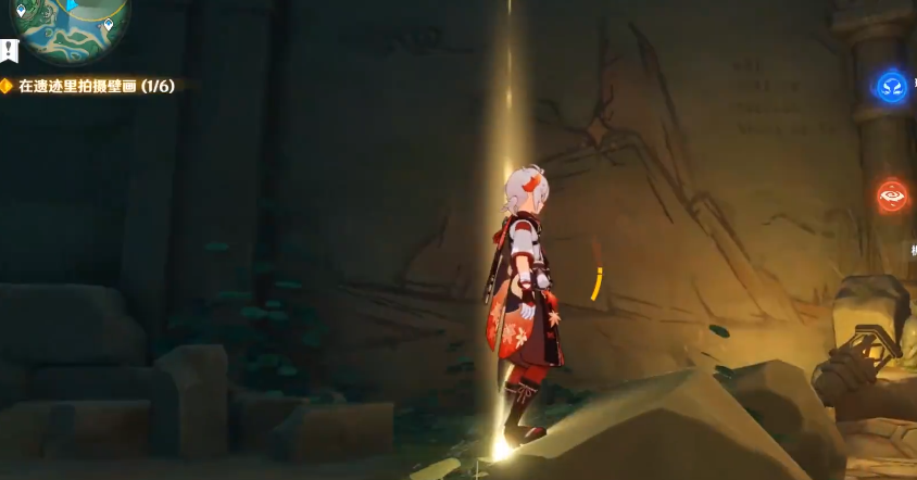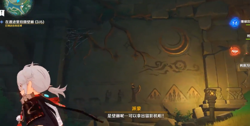 2、到知比山遺跡中通過照相功能拍攝壁畫,到達後直接跳到底,前往第一個解密房間出口,轉身,前往最右邊(下陷的房間處)。看到此標記,說明這面牆壁可以使用羽毛破除牆壁。然後順著路走到底,進入雷指針解密的房間。順著樹根的方向抬頭看,就可以看見壁畫了,但出現綠色提示,拍攝即可(用派蒙相機就行了),拍攝成功第一張壁畫照片。接下來原路返回,回到第一個解密房間的出口處,大致路線如圖。