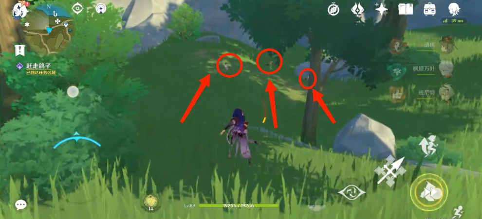 2、到樹林里找到鴿子,將鴿子趕走,下圖標注了兩處鴿子所在地。